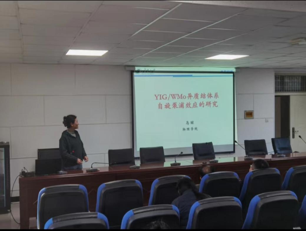 2023年11月9日下午,国产a片 马丽和张曜勃两位老师在博远楼217为国产a片 教师分别作“YIG/WMo异质结体系自旋泵浦效应的研究”和“高能粒子物理中最核心的观测量一散射振幅”专题报告会。