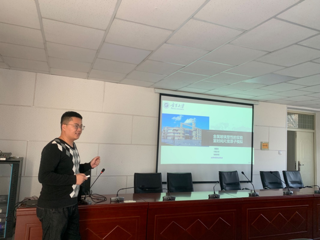 2023年11月22日下午,国产a片 周震亚老师和黄永巍老师在博远楼217为国产a片 教师作“金属玻璃塑性的实验室时间尺度原子模拟”和“拓扑绝缘体量子点中的太赫兹辐射”专题报告会。
