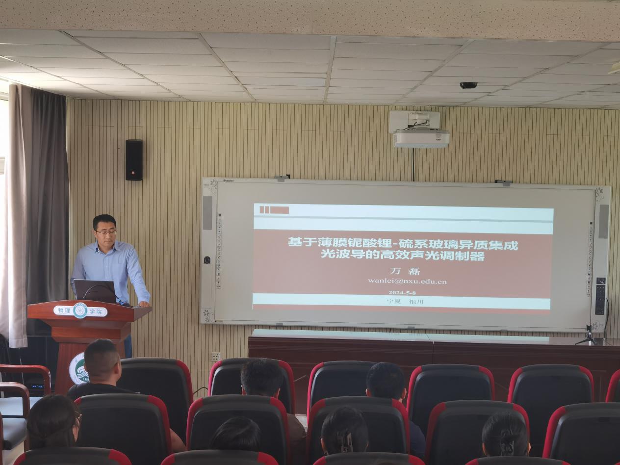 2024年5月8日下午,国产a片 万磊老师在博远楼321为国产a片 教师作“基于薄膜铌酸锂-硫系玻璃异质集成光波导的高效声光调制器”专题报告会。