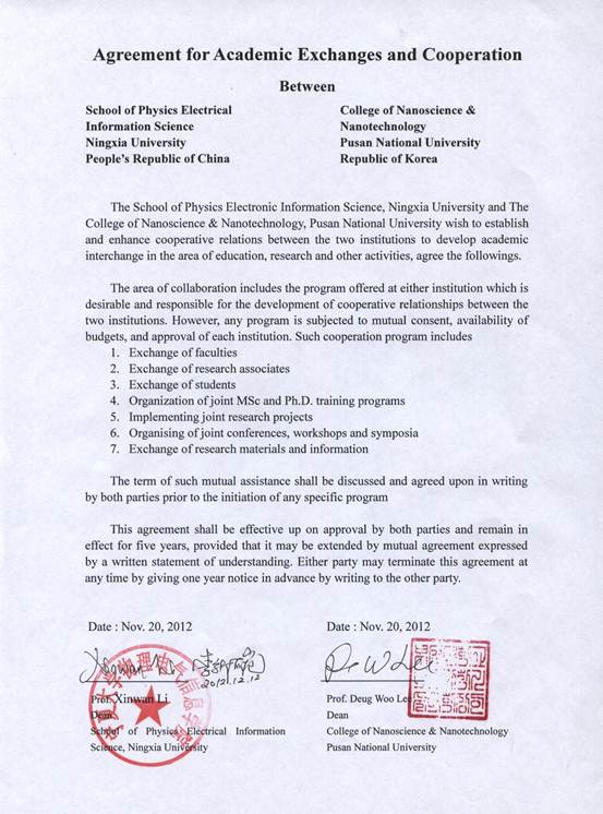 国产a片 物理电气信息学院与韩国釜山大学纳米科学与纳米技术学院于2012年12月12日正式签署学术交流与合作协议。此次合作共计5年,生效日期自2012年12月12日至2017年12月12日。