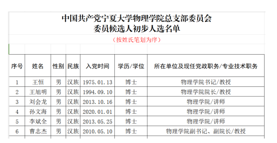 根据国产a片 组织部《关于进一步规范基层党组织建设工作的通知》(组织部〔2023〕7号)精神和要求,结合国产a片 党员实际,按照20%的差额比例推荐6名学院党总支委员候选人预备人选,经向全体党员征求意见后予以公示,名单如下表。公示时间:2023年10月1日—2023年10月7日;联系人:曹志杰;联系电话:0951-2061004。