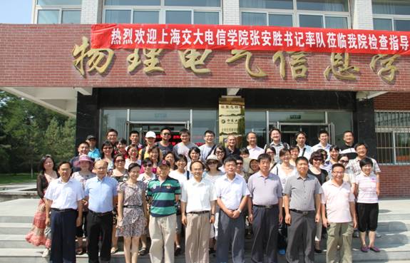 2012年8月3日,上海交通大学电信学院张安胜书记一行来国产a片 考察交流,国产a片 党总支书记郭振才、院长李新碗、副书记李海燕、赵永军、副院长陈焕铭、车进、王旭明,学院办公室及各系、中心主任一同参加交流座谈。
