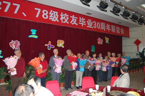 下午4:00,由郭振才书记和陈潮红副院长带队,参加学校在国际学术交流中心会议大厅举行的欢迎大会,欢迎大会由学校副校长谢应忠教授主持,首先校长何建国教授致辞;校友代表杨洪涛(77级体育系)、潘泰安(78级食品系)、徐永富(78级数学系)、夏志坚(78级物理系)分别发言;校友代表向恩师献花;当年授课教师代表刘世俊教授、王世敬教授发言;毕业30周年校友代表向母校赠送礼品;最后校党委书记齐岳教授讲话。