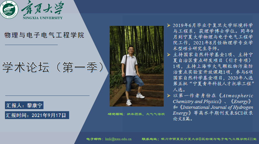 2021年9月17日下午3:00在学院206室进行“物电学术论坛”第一季,学院邀请黎康宁博士做学术报告。黎康宁结合自己的教学研究工作先后做了“Al6X (X= Si, N, Cu)团簇水解制氢和储氢机理研究”、“城市大气中黑碳气溶胶的混合态和吸湿性研究”及“近期工作计划”的精彩报告,同时介绍了在国家自然科学基金申请过程中的经验,分享了基金申请书中前言、技术路线及创新点的凝练方法。