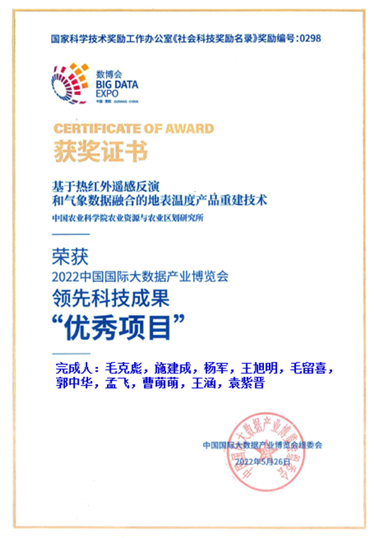 5月26日,2022中国国际大数据产业博览会领先科技成果奖正式揭晓。物理与电子电气工程学院参与中国农业科学院农业资源与农业区划研究所主持的 “基于热红外遥感反演和气象数据融合的地表温度产品重建技术”项目获2022数博会领先科技成果奖“优秀项目”奖项(完成单位:中国农业科学院农业资源与农业区划研究所、国产a片 、国家卫星气象中心、中国科学院国家空间科学中心、国家气象中和山东建筑大学;主要完成人:毛克彪,施建成,杨军,王旭明,毛留喜,郭中华,孟飞,曹萌萌,王涵,袁紫晋等)。
