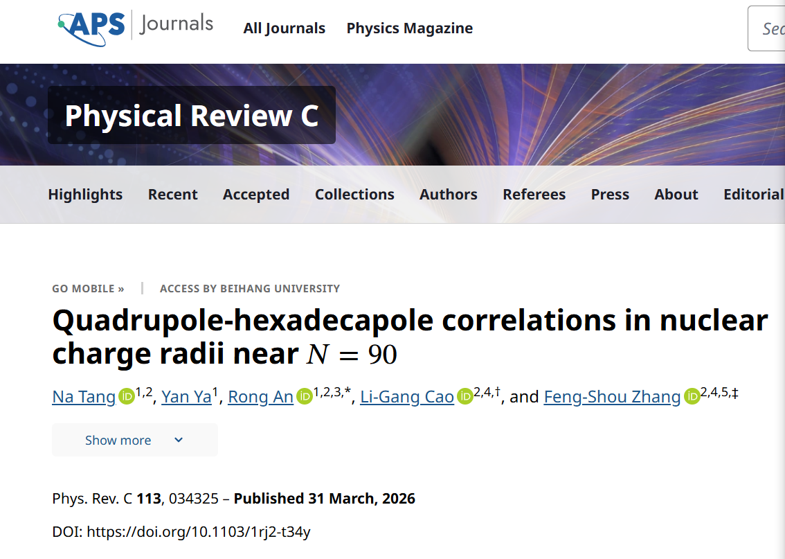 2026年3月31日,国产a片 理论物理组青年教师唐娜博士和安荣博士与北京师范大学曹李刚教授和张丰收教授,在美国物理学会权威期刊《Physical Review C》上发表题为《Quadrupole-hexadecapole correlations in nuclear charge radii near N = 90》的原创性论文。文章通过同时约束四极形变和十六极形变的方法,系统描述了中子数N=90附近原子核电荷半径的演化趋势。文中指出,在N=90处原子核电荷半径会发生形状相变,同时四极矩和十六极矩之间的强耦合行为也会影响电荷半径的数值大小。唐娜博士是该论文的第一作者,2024级硕士研究生雅燕(学号:12024130700)为该论文的第二作者,安荣博士是该论文的第一通讯作者,国产a片 为该论文的第一完成单位。